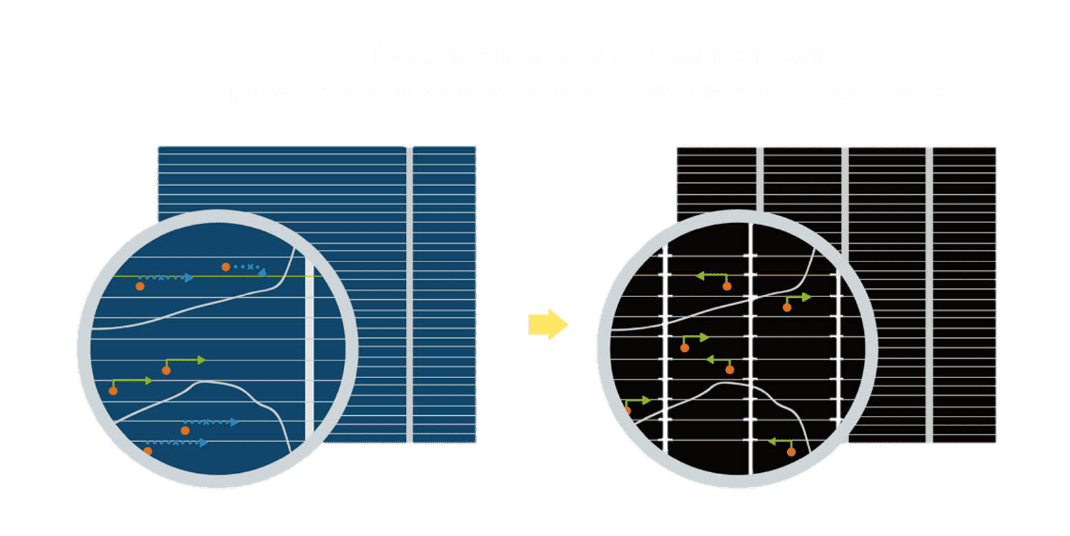 - 结合半切电池,,,,降低遮阴影响、、、、提升模组抗隐裂能力、、并减少电阻损耗,,,,进一步提升模组发电效能。。。
