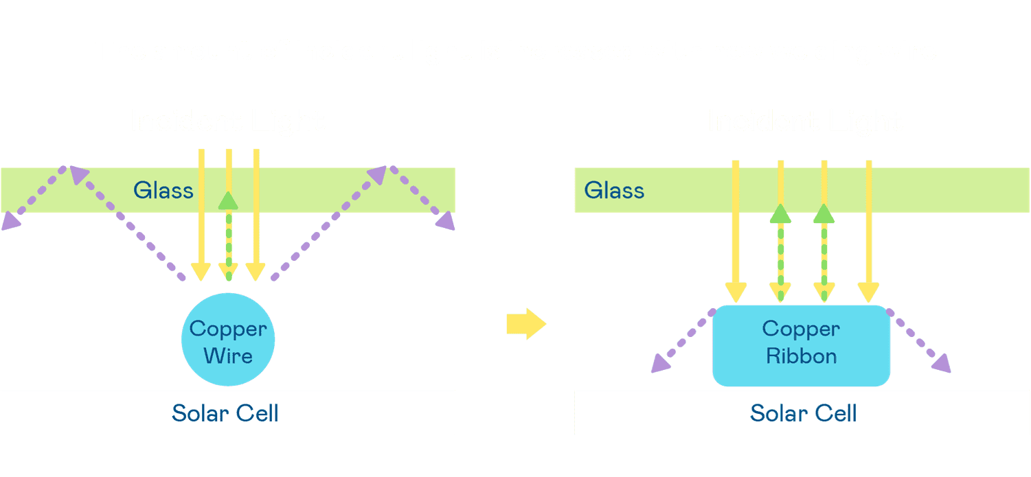 - 电池使用多条铜导线 (Copper wire) 于电池片上形成较短的电流路径,,,提高电流收集效率,,,采用圆形设计的铜导线较传统扁平式的铜焊带 (Ribbon),,可增加入射至电池的光线量。。
