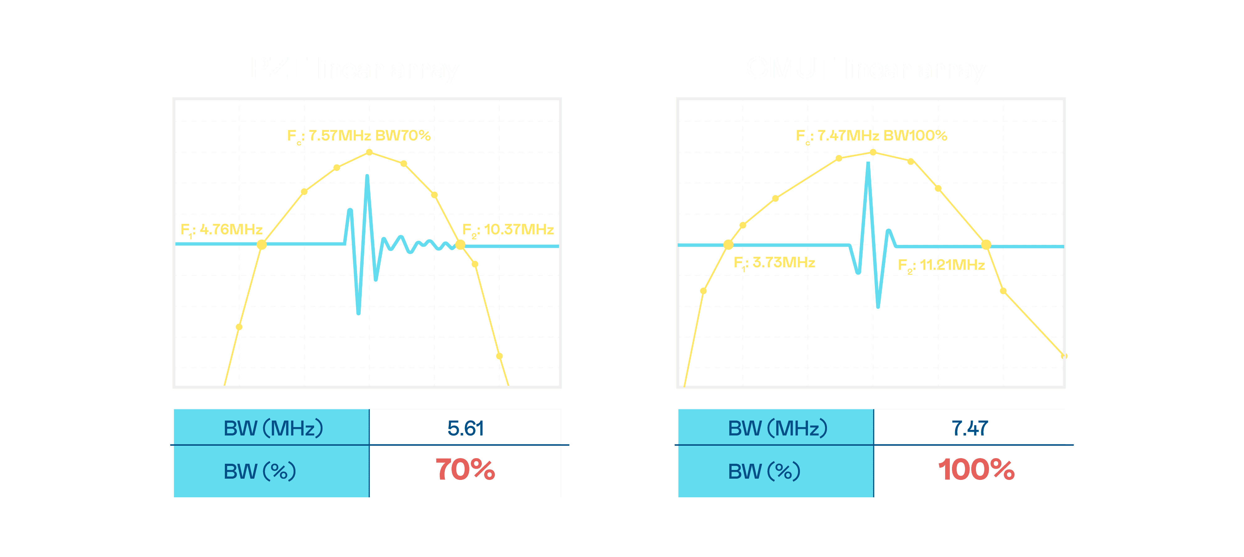 超音波影像的解析度高低,,首先取决于探头能发出的讯号频宽。。。赏金国际 CMUT 可提供高清晰的超音波讯号,,,,提供高频宽、、高灵敏度、、、、影像纹理细节更高的超音波影像,,,协助医护人员缩短影像判读时间及利用精准的医疗影像进行诊断。。